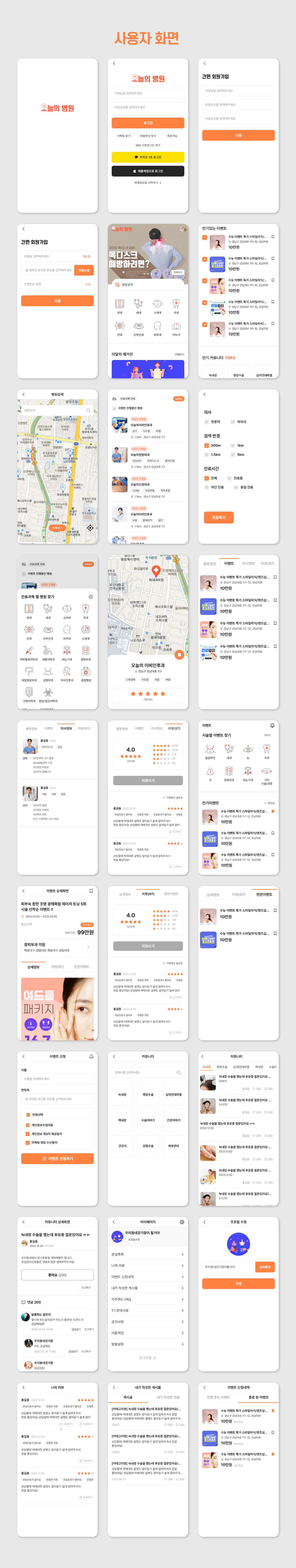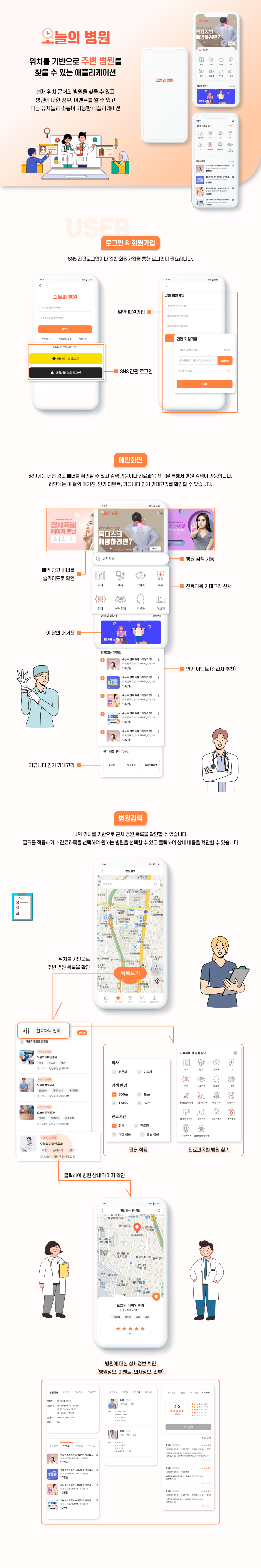 - 병원 상세페이지에서 병원 위치와 기본적인 정보, 병원에서 진행중인 이벤트와 의사정보, 다른 회원들이 작성한 병원 리뷰등을 확인할 수 있습니다.