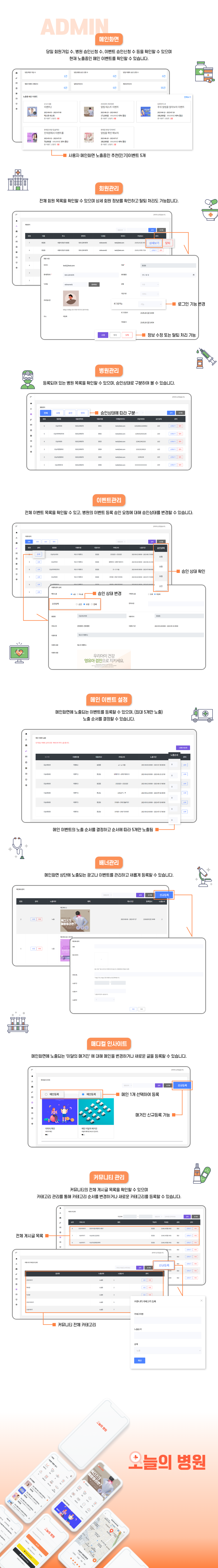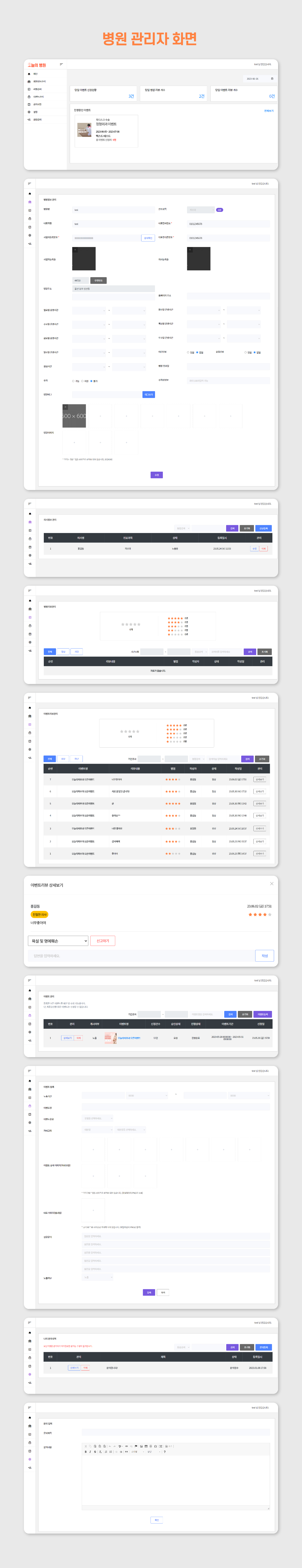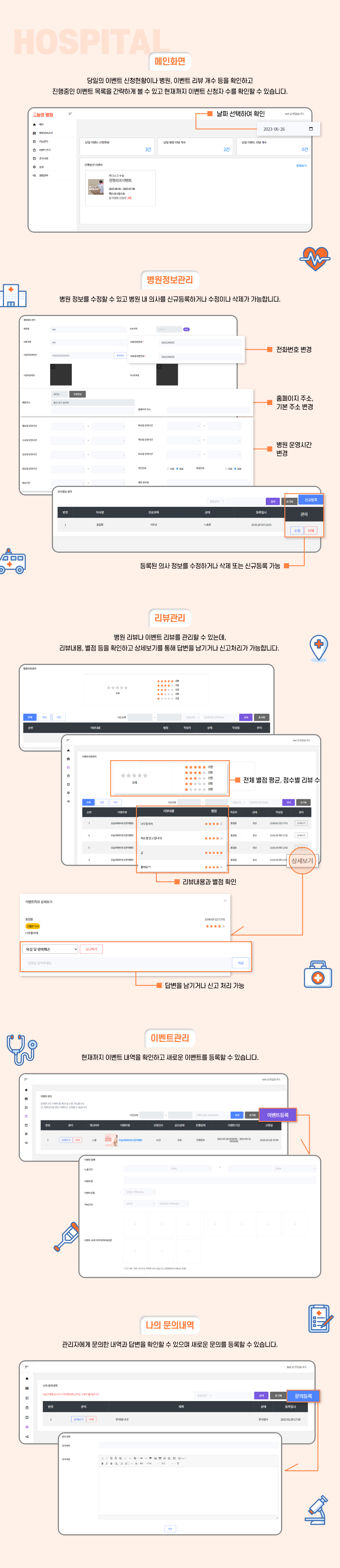 - 회원들이 작성한 병원 및 이벤트 리뷰를 확인하고 관리할 수 있습니다.