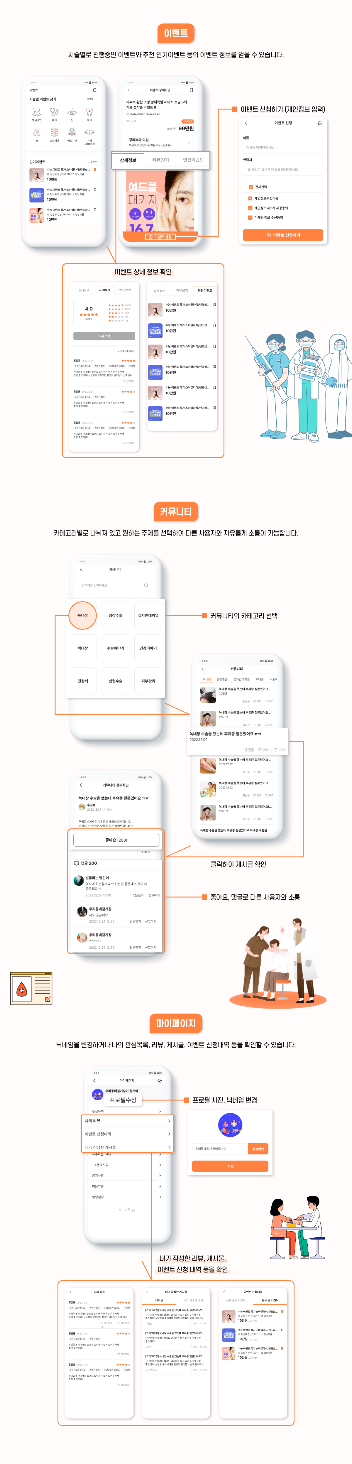 - 이벤트 메뉴에서 시술별로 진행중인 이벤트와 추천 인기이벤트 등 이벤트에 대한 정보를 확인할 수 있습니다.